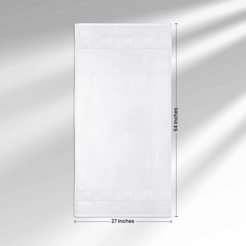 The design of the Kashmir Deluxe white bath towels is accentuated by a Fancy Dobby Border, adding a refined, stylish finish.