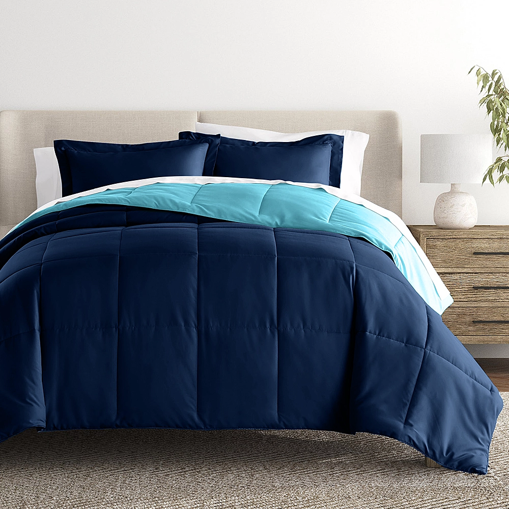 The fabric used in this bedding product ensures a soft texture while offering resistance to wear and tear. Our navy blue reversible comforter variant completes the design spectrum, providing clients with a modern and versatile bedding option.